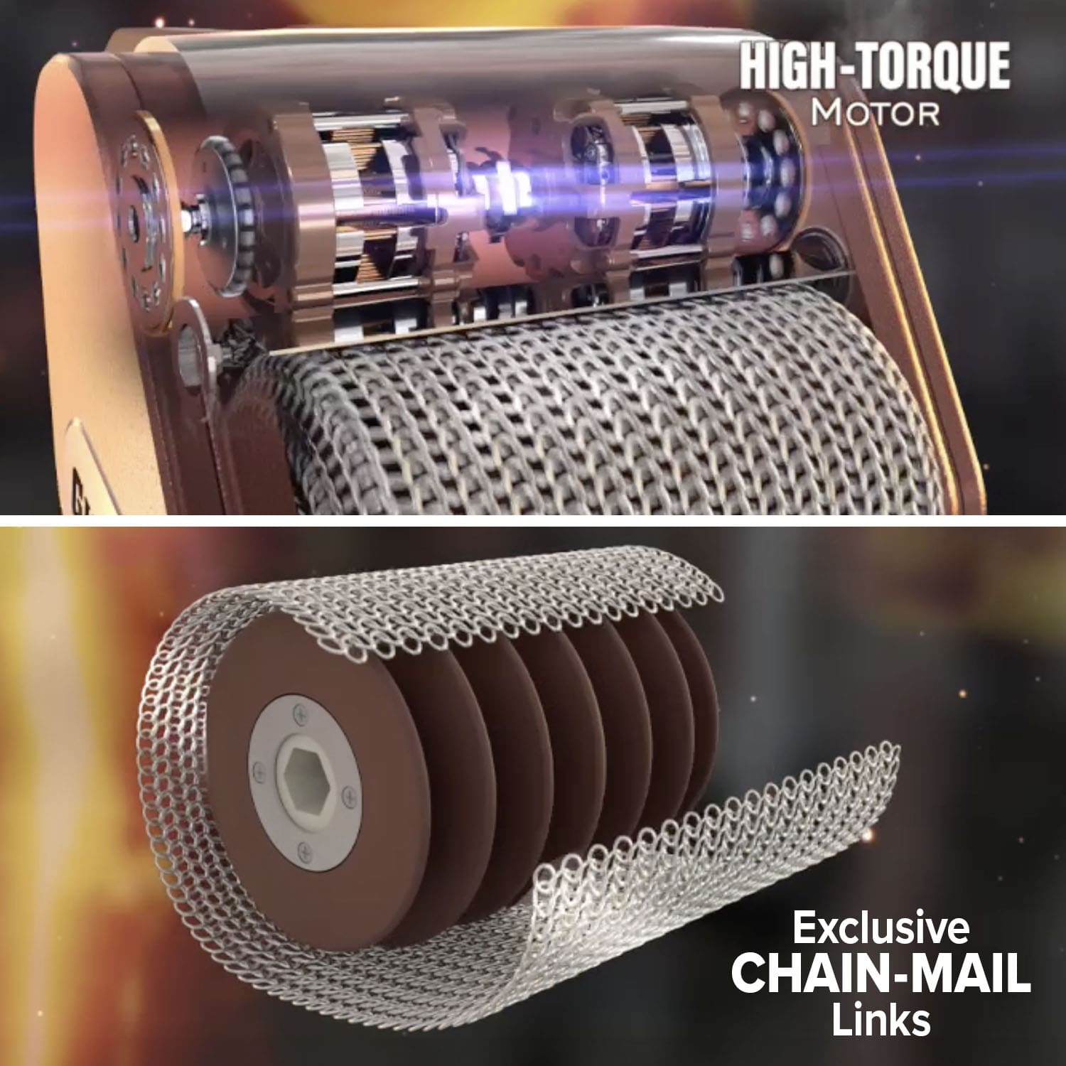 The Horsepower Giddy Up features a stainless steel power roller that spins at 350 RPM to effectively scrub away grime without risking dangerous bristles in your food.