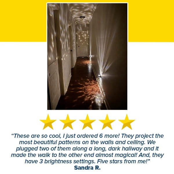 The night light plugs into any standard outlet and uses a dual-faceted crystal sphere to refract LED light, projecting intricate patterns onto walls and ceilings while providing soft illumination.