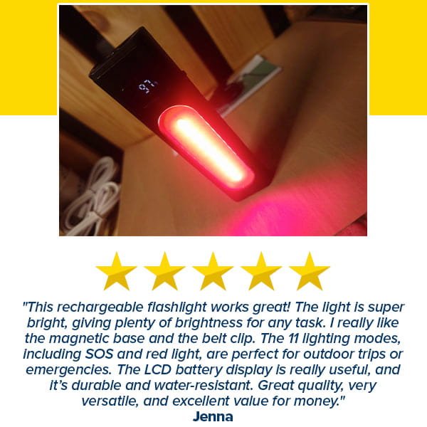 The flashlight features an 800-lumen main light and an 1800-lumen side light with upgraded LED chips for exceptional brightness.