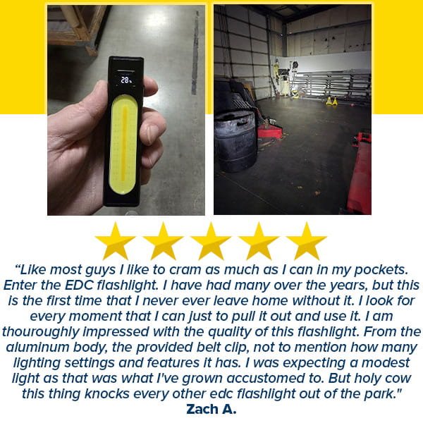 The flashlight measures 4.9” long by 1.4” wide and weighs just 2.9 oz, making it slim, lightweight, and portable.