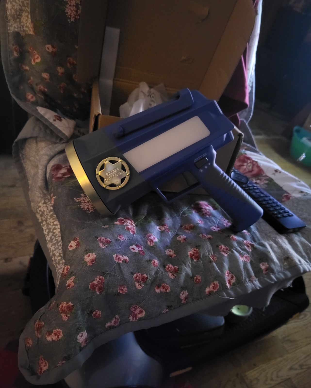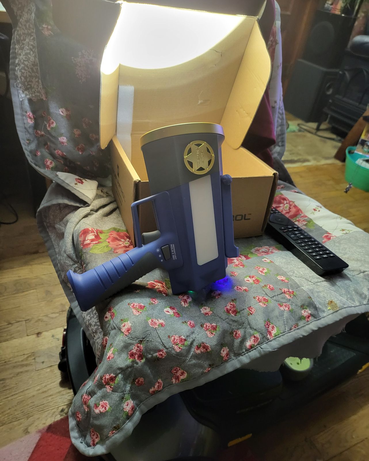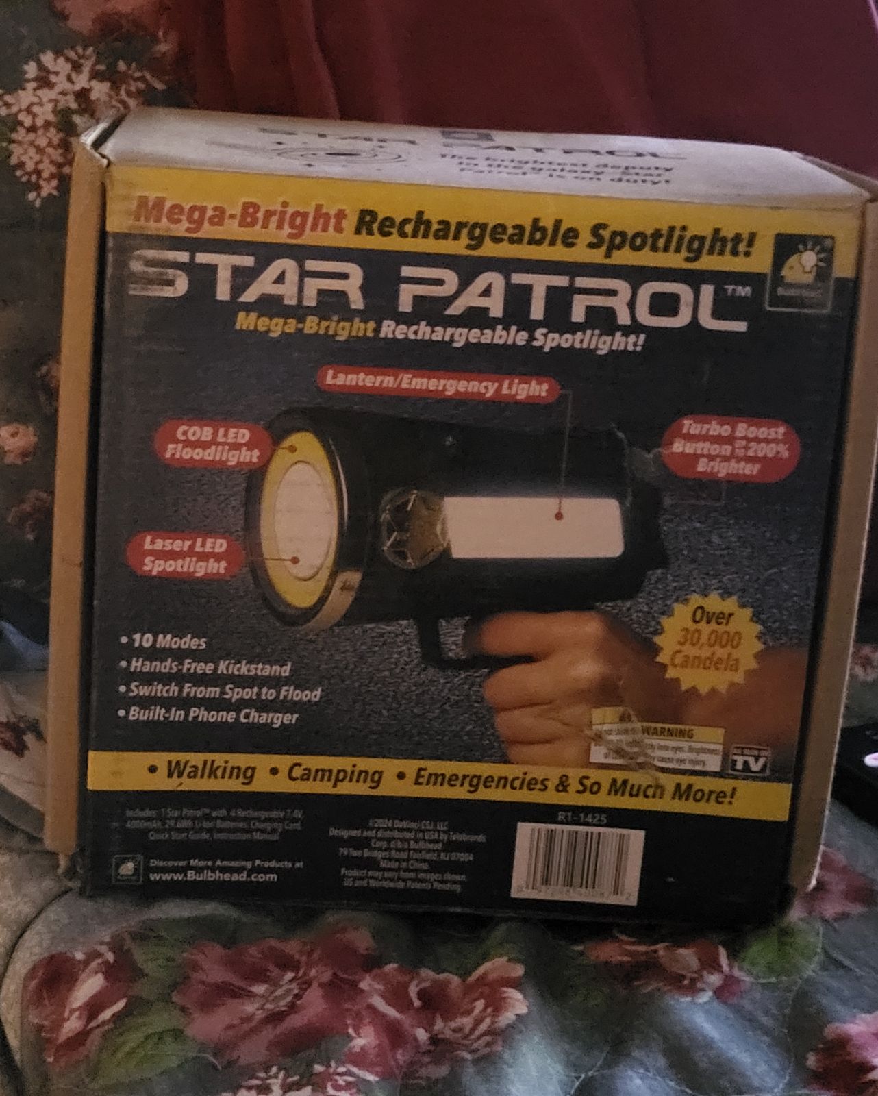 The Star Patrol Mega-Bright Spotlight features 10 different lighting modes, including a spotlight for distance, a flood light for coverage, red and blue flashing for emergencies, and a lantern mode for blackouts.
